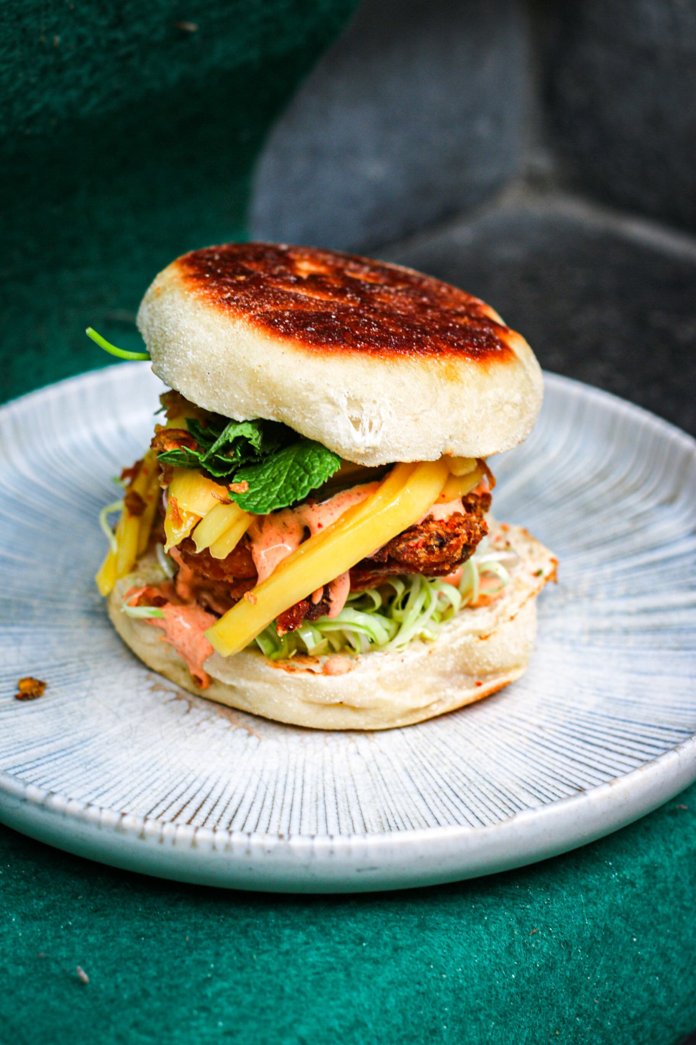 De Bollywood Bunner, een ode aan de sprankelende smaken van India, wordt gekenmerkt door zijn rijke samenstelling. Crispy fried chicken vormt de basis, rijkelijk overgoten met een romige tandoori-yoghurtdressing. Het geheel wordt verder verrijkt met verse mango, gepekelde komkommer en een spitskoolsalade met rozijnen en appelazijn. De afwerking met gebakken uitjes, verse munt, koriander en een snufje shichimi togarashi, zorgt voor een smaakvolle explosie van zoet, zuur, romigheid en spice.