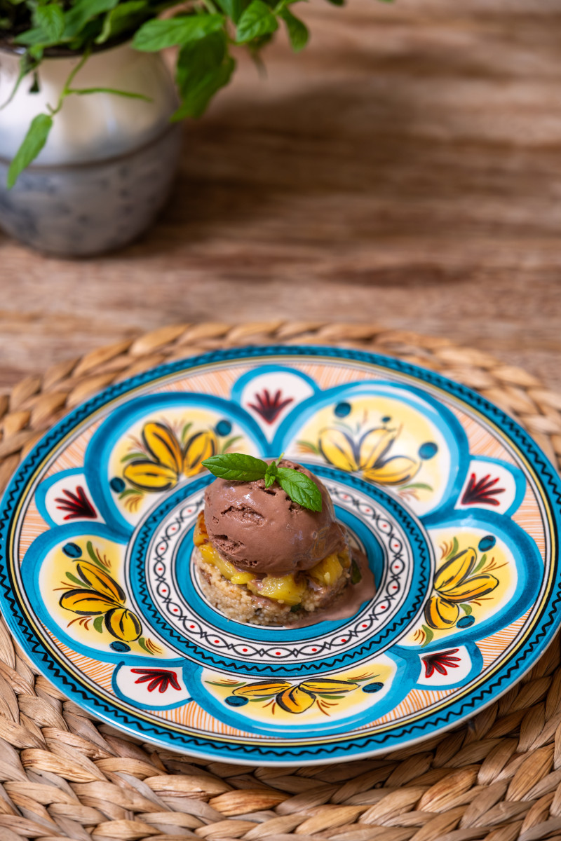 Deze zoete couscous met chocolade-ijs is een verrassend, aromatisch dessert dat tropische smaken combineert met warme specerijen. De couscous wordt gemengd met abrikozen, vijgen, dadels en rozijnen, afgewerkt met een vleugje gembersiroop en citroenzeste voor extra frisheid.