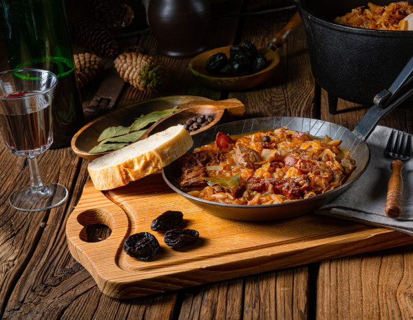 Kleur het varkensvlees in hetzelfde vet goudbruin aan alle kanten. Voeg de ui toe en laat glazig worden. Voeg daarna kool, zuurkool, laurier, jeneverbessen en paddenstoelen toe. Roer alles goed door.