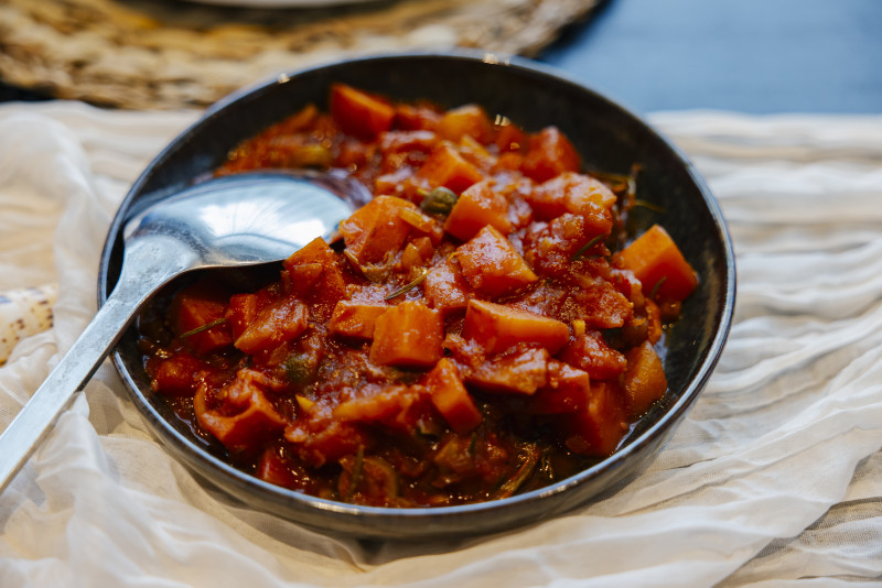 Wie Curaçao zegt, denkt meteen aan witte stranden en kleurrijke gebouwen. Maar ken jij de Curaçaose keuken al? Het eiland is een smeltkroes van culturen, van Nederlands tot Afrikaans en Latijns-Amerikaans, en dat proef je ook in de keuken. Wij mochten een namiddag achter het fornuis doorbrengen met Justin Niessen, de chef die bekend werd door Masterchef Holland in 2016 en die graag het eten uit zijn geboorteland met de wereld deelt. Als hoofdgerecht verschijnen er twee stoofpotjes op tafel, waaronder deze ‘papaya stoba’.